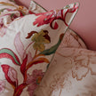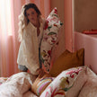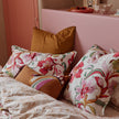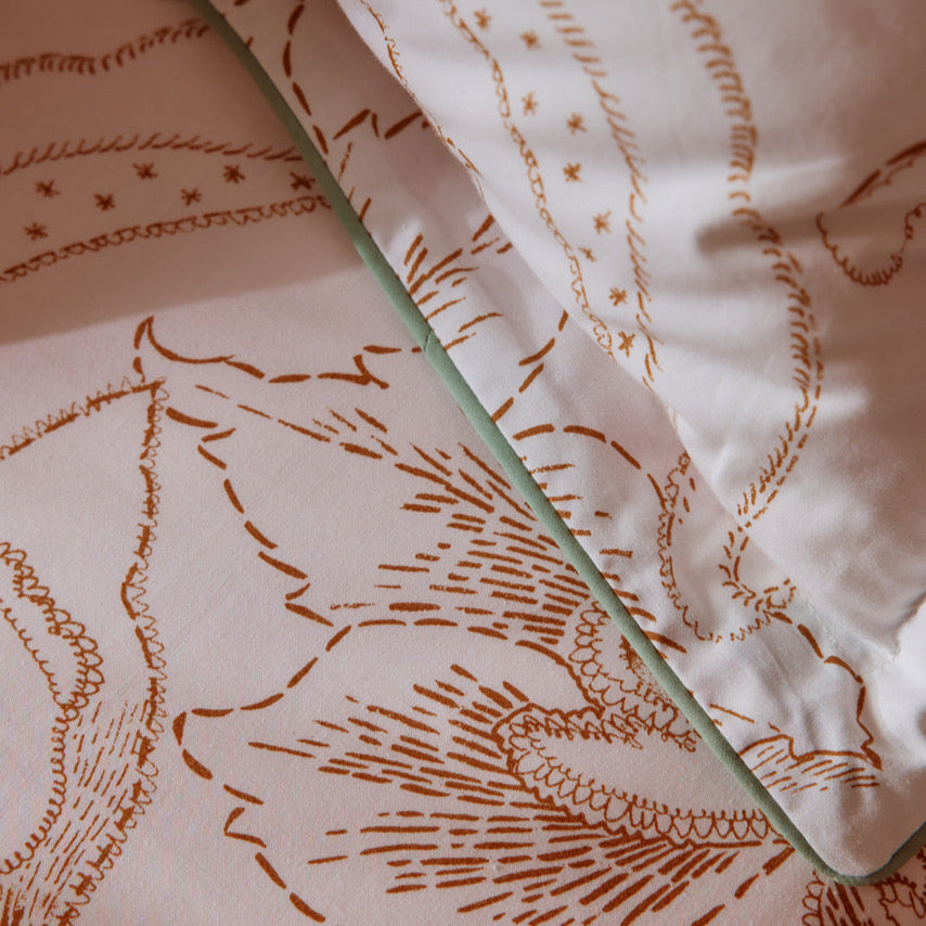 Homage to the Italy of the 70s: its joie de vivre, elegance and extravagance. On a generous white cotton percale, powder pink and fuchsia flowers mix with ochre, light purple and green foliage. The reverse is lighter: a floral outline pattern, dotted and ochre, on a white background. A flower garden inspired by the Mediterranean: spectacular and fascinating.